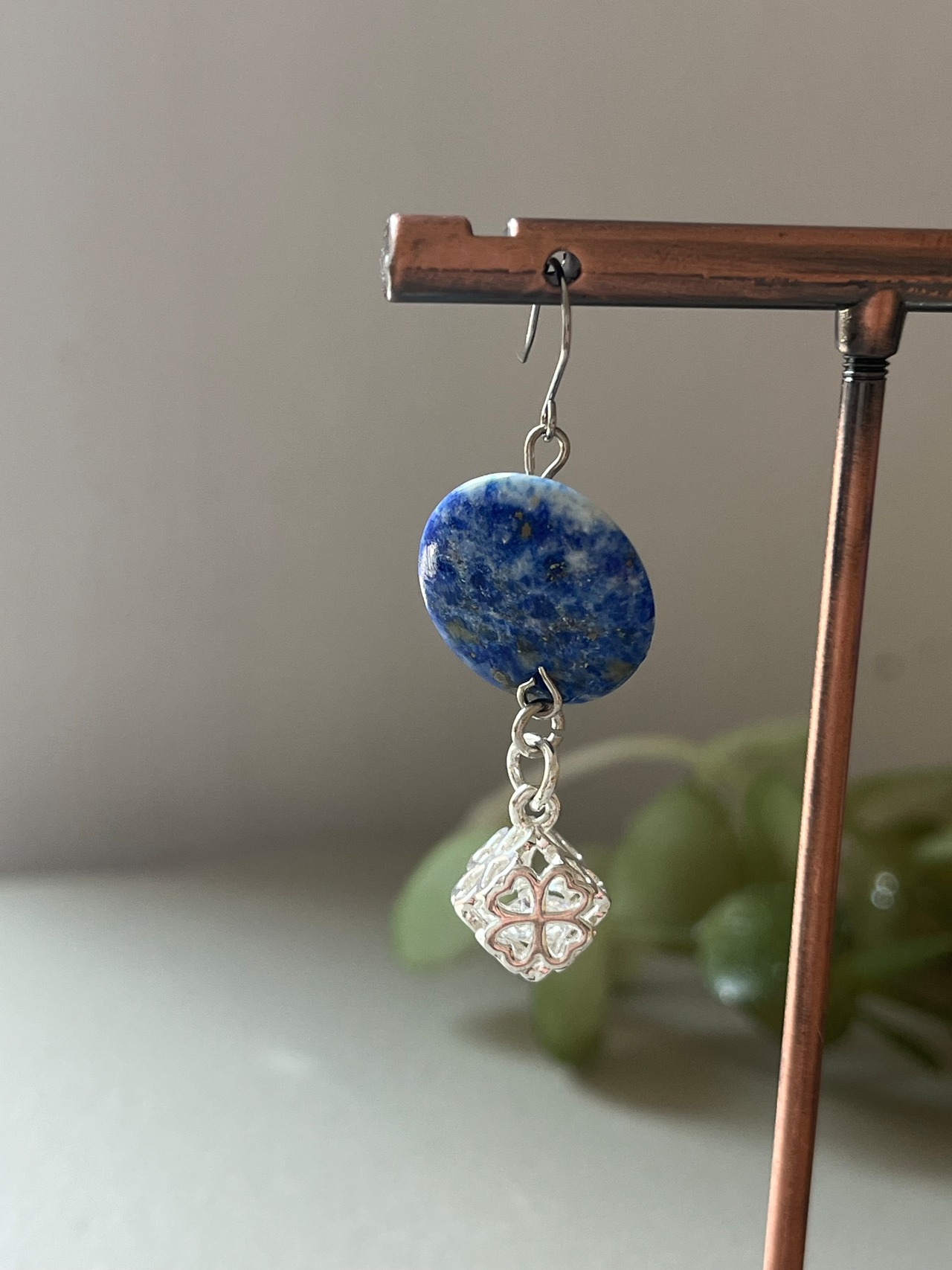 円形のラピスを使用、面白く可愛いピアスです